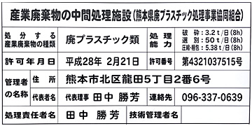 | 事業の概要 | 搬入された廃プラスチック類を、再生利用率を向上させる為選別作業の程度を上げる。 選別後、再生利用可能な廃棄物は再生工場へ処理委託し、再生不可能な廃棄物を最終処分基準の15p×15p以下に破砕(切断)し、安定型埋立処分場へ処理委託する。 |